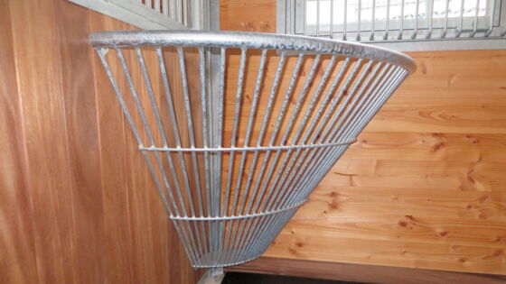 Dieser halbrunde Trog wurde speziell für die Raufuttergabe entwickelt und besteht wahlweise aus hochfestem Polyethylen (HDPE) oder verzinktem Stahl. Die Montage in einer Boxenecke ist denkbar einfach und das glatte Material lässt sich leicht sauber halten.