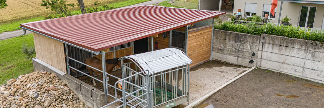 Durch den neuen Stall – auf derselben Mistplatte – haben die Pferde nun einen geschützten und schönen Liegebereich mit Fütterungsplatz. Ein permanent zugänglicher Auslauf rundet das Wohlfühlpaket für die Pferde ab. Unsere Kundschaft vefügt zudem über einen Sattelkammer- und Futterraum.