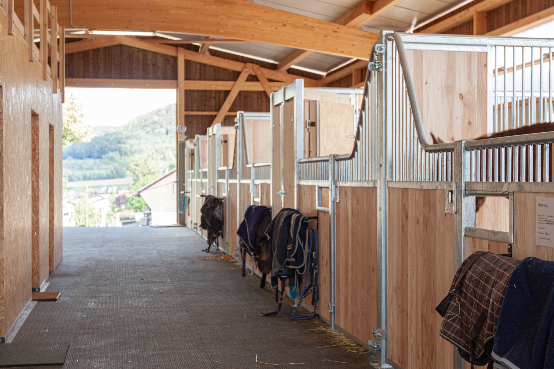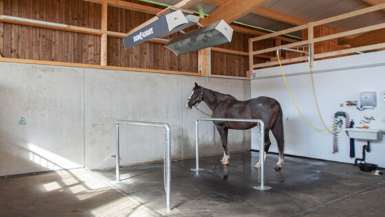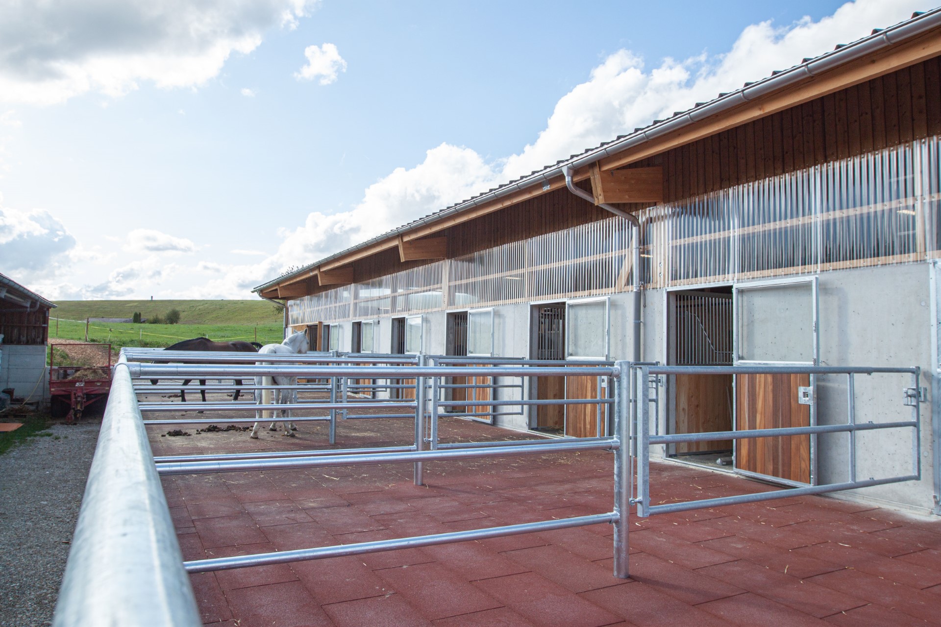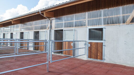 Der private Pensionsstall Ziegelhof in Effingen umfasst sieben Einzelboxen in einer Reihe und drei weitere Einzelboxen, die durch das flexible Vario-System als Laufstall (Gruppenhaltung) umgenutzt werden können. Einer der beiden Waschplätze wurde zusätzlich mit einem Solarium ausgestattet. In die Boxenfronten wurde bauseits ein automatisches Fütterungssystem eingebaut. So findet die Heufütterung durch zeitgesteuerte Klappen statt. Das Gebäude wurde bauseits in Massiv- und Holzbauweise erstellt. Die as pferdestall gmbh zeichnete für den gesamten Innenausbau und die Aussenplätze verantwortlich.