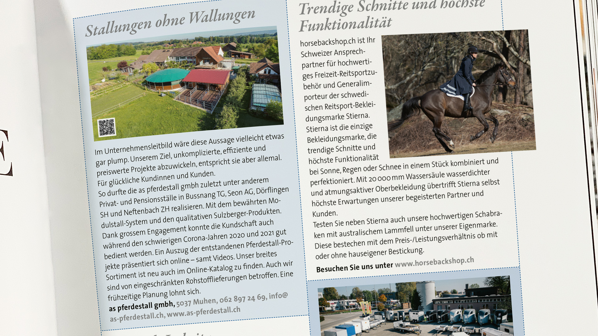 Unser breites Sortiment ist neu auch im Online-Katalog zu finden. Auch wir sind von den eingeschränkten Rohstofflieferungen betroffen. Eine frühzeitige Planung lohnt sich. Die as pferdestall gmbh setzt sich auch weiterhin für baulich nachhaltige Lösungen ein, welche die Gesundheit der Pferde ins Zentrum stellen. Dafür – und als seriöser Abschluss dieses Artikels – steht unser Firmenslogan «Für glückliche Pferde».