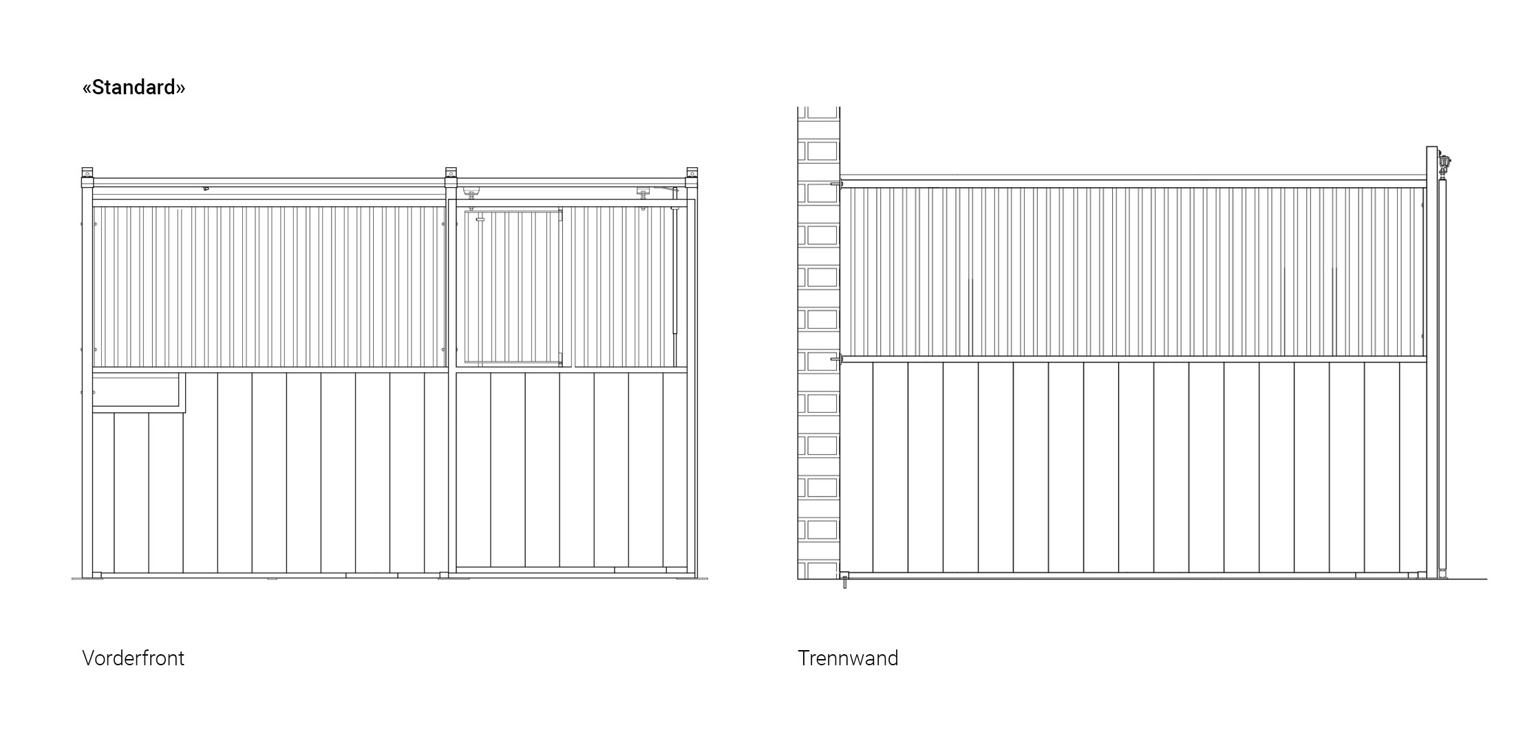 Die Pferdeboxen «Standard» sind 2.30 m hoch, die Holzhöhe beträgt 1.30 m. Der Gitterteil besteht aus senkrechten Rohren (1/2"), die mit 5 cm lichtem Abstand angebracht sind. Die Gitterstäbe sind verdeckt geschweisst. Die Schweissnähte sind dadurch nicht sichtbar und können keine scharfen Kanten bilden.