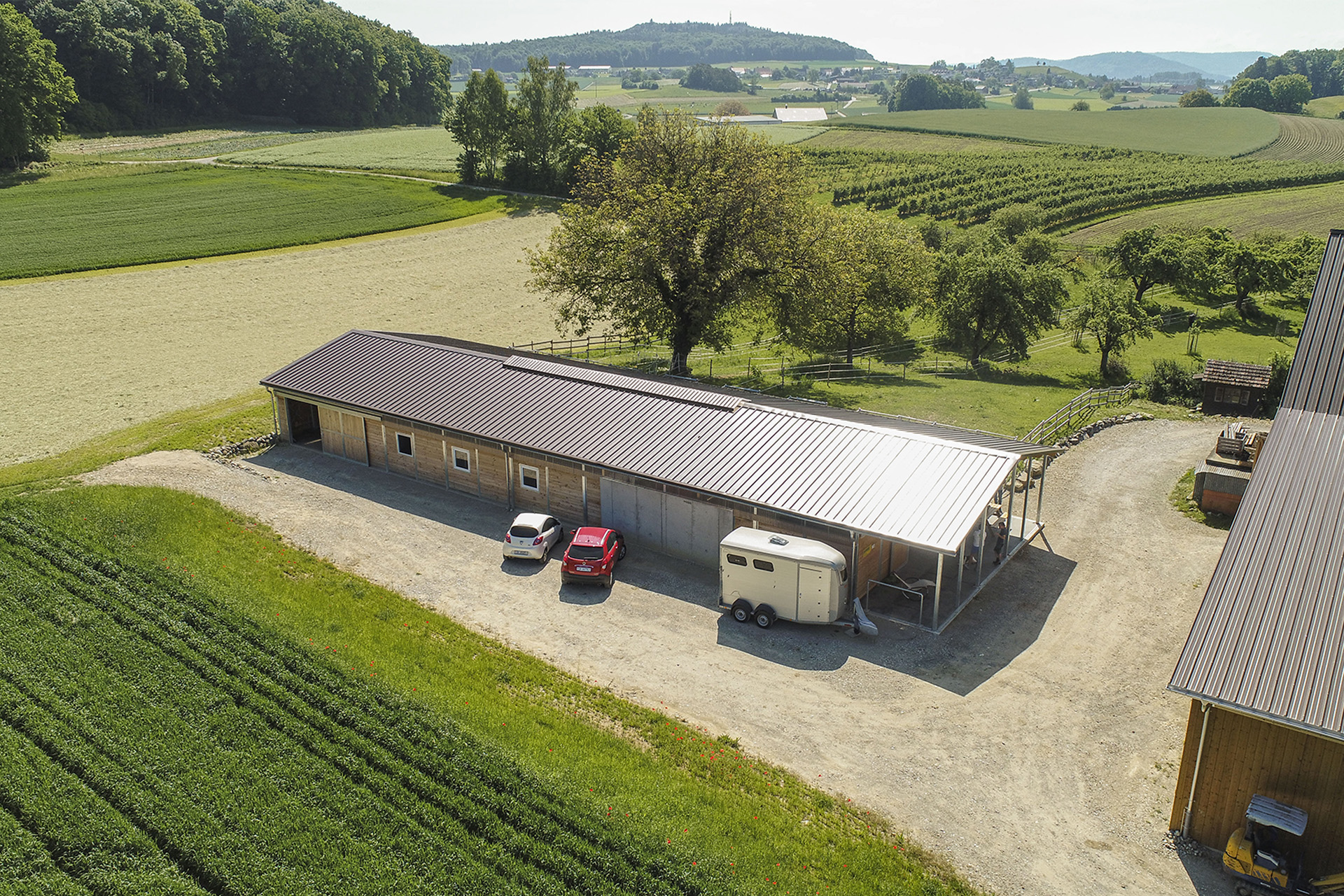 Familie Schlatter erweiterte im Jahr 2021 ihren Landwirtschaftsbetrieb mit einer Pferdepension. Im neuen Stallgebäude sind acht Einzelboxen, Nebenräume, Waschplätze, ein Solarium sowie ein Futter-, Stroh- und Heulager untergebracht. Die an die Boxen angrenzenden Paddocks verfügen über einen direkten Weidezugang und bieten den Pferden einen hervorragenden Auslauf.