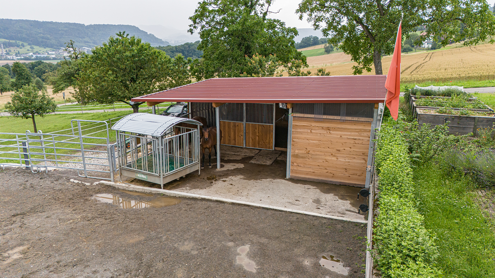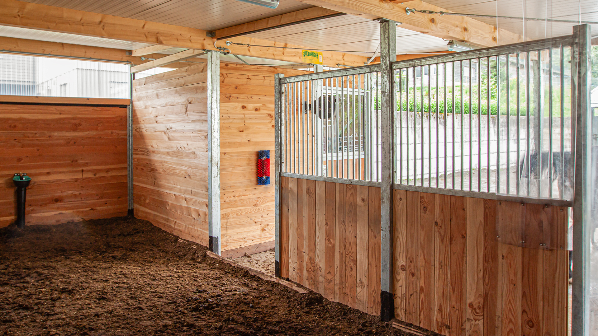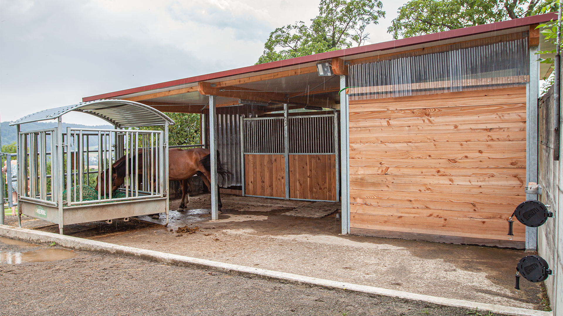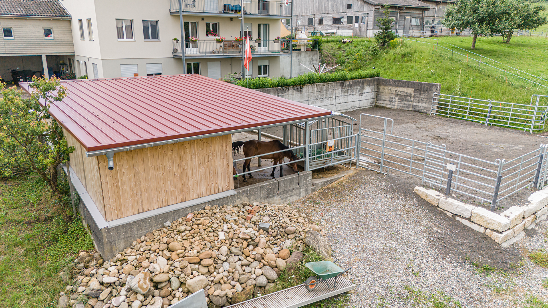 Durch den neuen Stall – auf derselben Mistplatte – haben die Pferde nun einen geschützten und schönen Liegebereich mit Fütterungsplatz. Ein permanent zugänglicher Auslauf rundet das Wohlfühlpaket für die Pferde ab. Unsere Kundschaft vefügt zudem über einen Sattelkammer- und Futterraum.