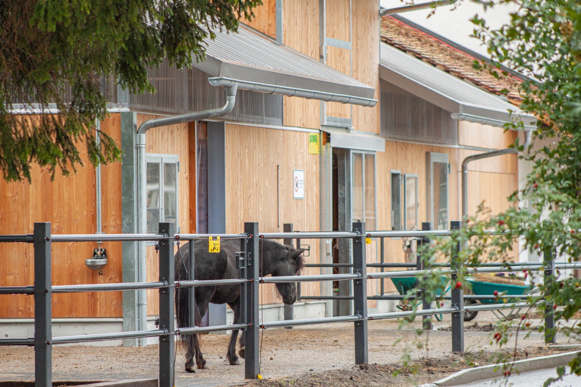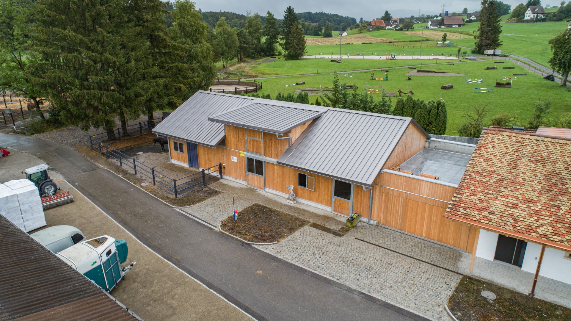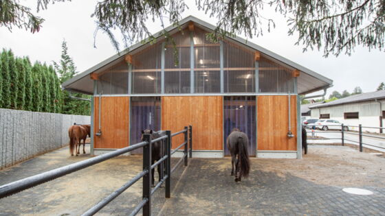Der Modulstall wurde 2-stöckig errichtet, wobei der obere Stock als Heu- und Strohlager dient und mittels Treppe erschlossen ist. Er beherbergt einen Laufstall für acht Pferde und zwei Laufstallungen für je fünf Pferde, die dank des flexiblen Vario-Systems zu einem grossen Laufstall für zehn Pferde zusammengeschlossen werden können. Zur effizienten Fütterung sind die Futterstände in der Mitte des Stalls platziert. Der Aussenbereich wurde bauseits mit Paddocks erstellt. Wegen des Ortsbildschutzes musste eine Spezialfassade erstellt werden. Das gesamte Gebäude wurde ab Bodenplatte von der as pferdestall gmbh realisiert.